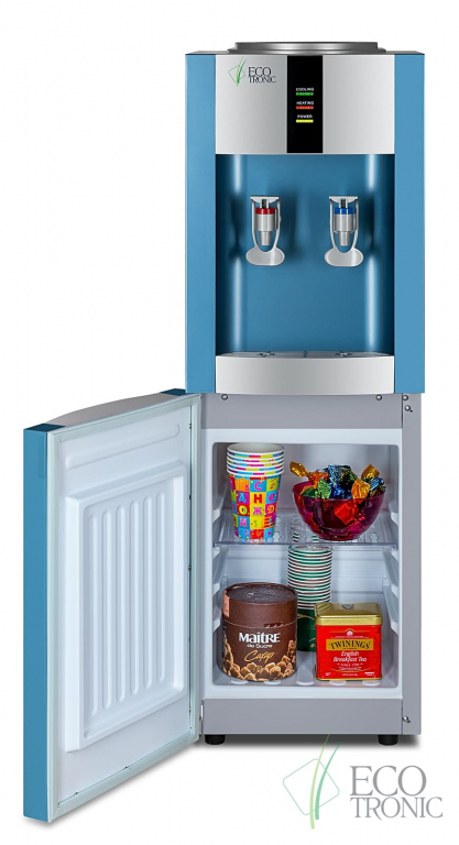 Кулер для офиса Ecotronic H1-LCE - новая базовая модель с электронным охлаждением, приятным серебристым цветом и надежными краниками подачи воды (нажим кружкой). В нижней части кулера Ecotronic H1-LCE - просторный шкафчик для посуды.